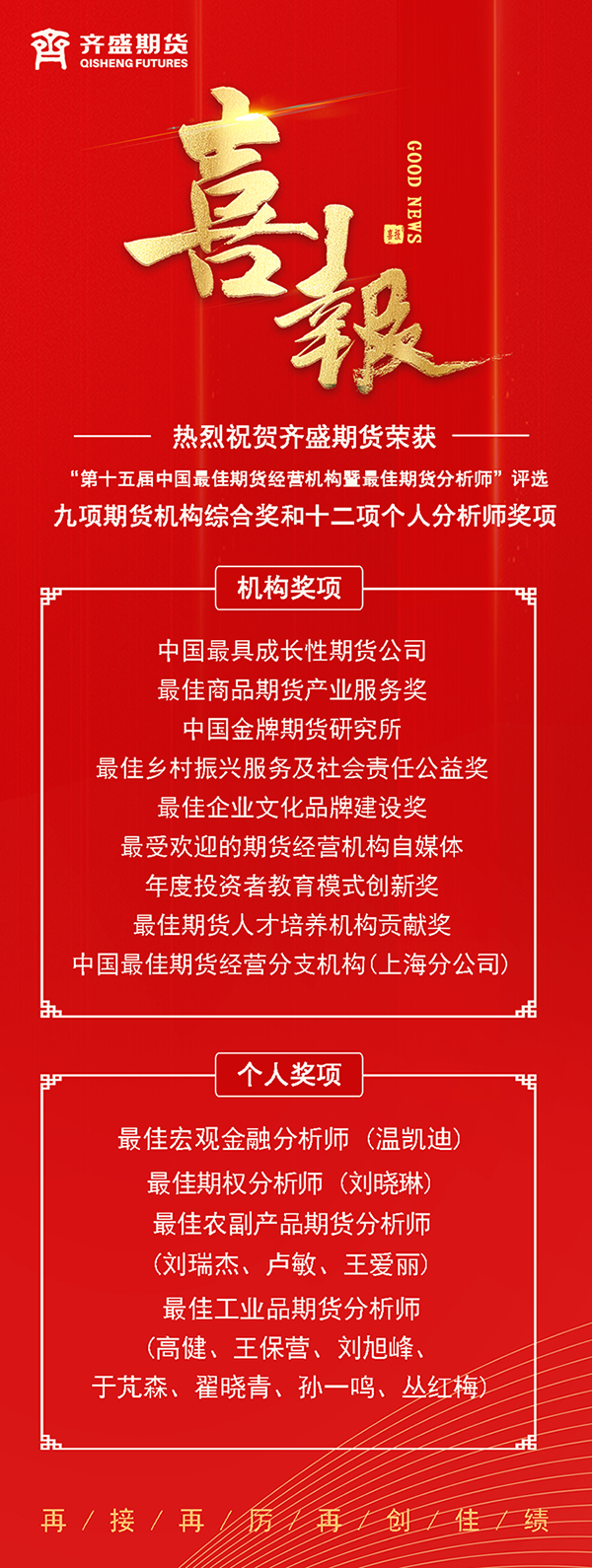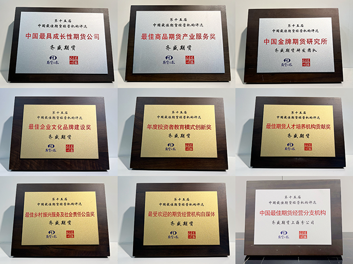 近日,由《證券時報》、《期貨日報》聯(lián)合主辦的“第十五屆中國最佳期貨經(jīng)營機構暨最佳期貨分析師評選”活動中,山東齊盛期貨有限公司榮獲“中國最具成長性期貨公司”、“最佳商品期貨產(chǎn)業(yè)服務獎”、“中國金牌期貨研究所”、“最佳鄉(xiāng)村振興服務及社會責任公益獎”等九項期貨機構綜合獎和十二項個人分析師獎項。 據(jù)悉,"中國最佳期貨經(jīng)營機構暨最佳期貨分析師評選活動"已成功舉辦了十五屆,是國內(nèi)設立最早、期貨行業(yè)中最具權威和影響力的評選活動。