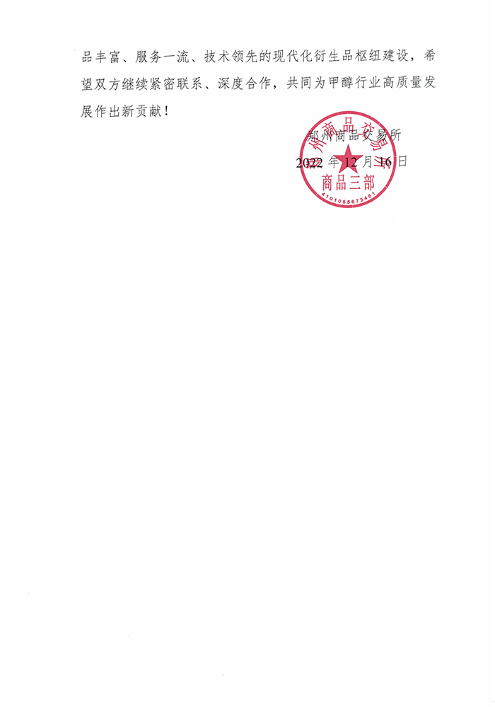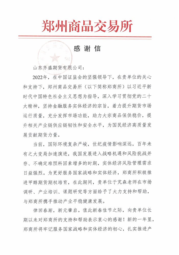 近日,山東齊盛期貨有限公司收到了鄭州商品交易所的感謝信。信中對(duì)2022年我司高級(jí)分析師于芃森在市場(chǎng)調(diào)研、產(chǎn)業(yè)培訓(xùn)、課題研究等方面給予了大力支持和幫助,為甲醇期貨相關(guān)工作的開(kāi)展提供了有力保障表示了感謝,并一次性獎(jiǎng)勵(lì)我司2萬(wàn)元資金。
