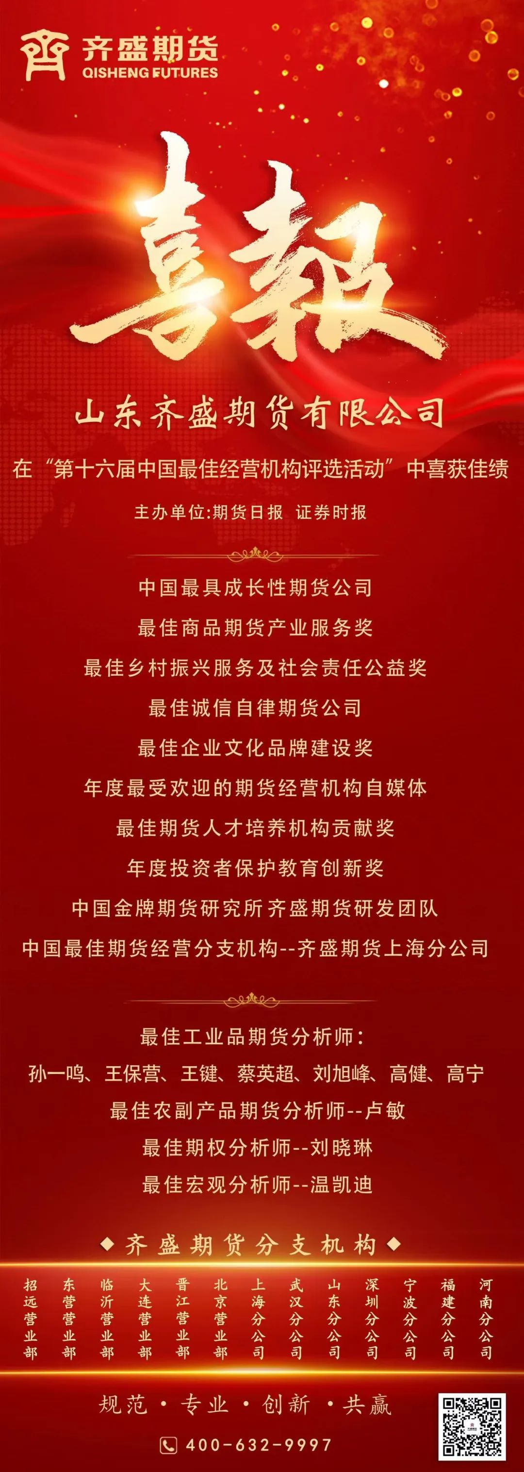 近日,由《證券時(shí)報(bào)》、《期貨日?qǐng)?bào)》聯(lián)合主辦的“第十六屆中國(guó)最佳期貨經(jīng)營(yíng)機(jī)構(gòu)暨最佳期貨分析師評(píng)選”中,齊盛期貨再次創(chuàng)造佳績(jī),榮獲“中國(guó)最具成長(zhǎng)性期貨公司”、“中國(guó)金牌期貨研究所”、“最佳鄉(xiāng)村振興服務(wù)及社會(huì)責(zé)任公益獎(jiǎng)”、“最佳誠(chéng)信自律期貨公司”等十項(xiàng)機(jī)構(gòu)綜合獎(jiǎng)。同時(shí),齊盛期貨的十名分析師也分別榮獲“最佳宏觀期貨分析師”、“最佳期權(quán)分析師”、“最佳農(nóng)副產(chǎn)品期貨分析師”、“最佳工業(yè)品期貨分析師”的榮譽(yù)稱號(hào)。