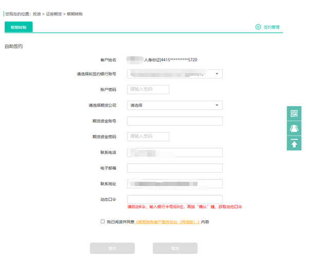 選擇期貨公司,輸入資金賬號、密碼等信息,勾選“我已閱讀并同意”,點擊提交。