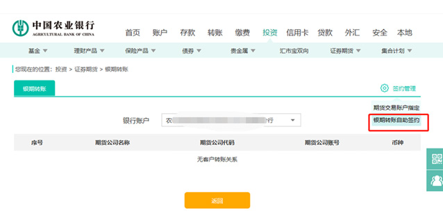 點擊“簽約管理”,選擇“銀期轉賬自助簽約”。