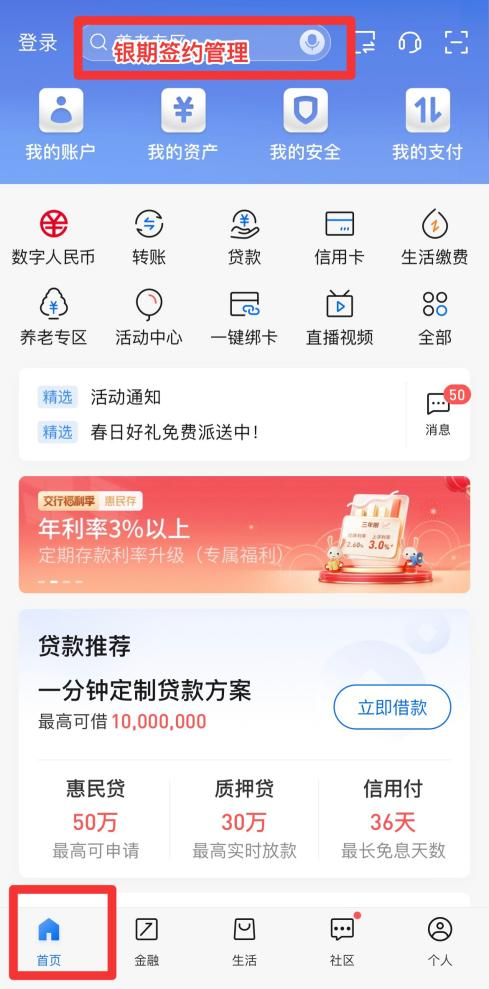 首頁上方搜索欄輸入“銀期簽約管理”。