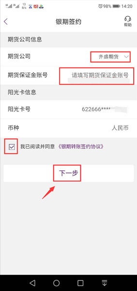 選擇期貨公司,輸入資金賬號,勾選“我已閱讀并同意“,再點(diǎn)擊下一步。