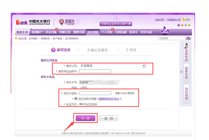 選擇期貨公司,輸入保證金照號(hào),輸入銀行交易密碼,勾選“我已閱讀“,然后點(diǎn)擊下一步。
