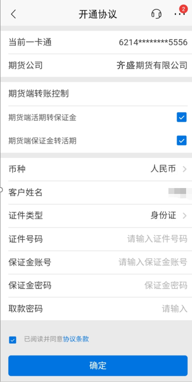 勾選期貨端轉(zhuǎn)賬控制,輸入保證金賬號、密碼等信息,勾選“已閱讀并同意協(xié)議“,點(diǎn)擊確認(rèn)。