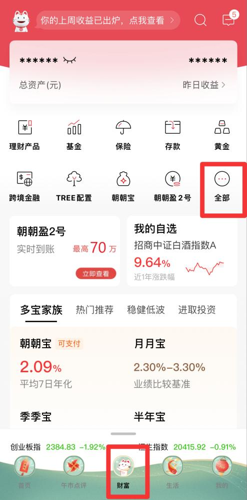 登錄招商銀行個(gè)人手機(jī)銀行,點(diǎn)擊“財(cái)富”-全部。